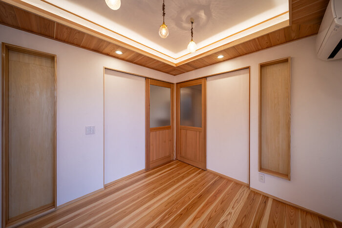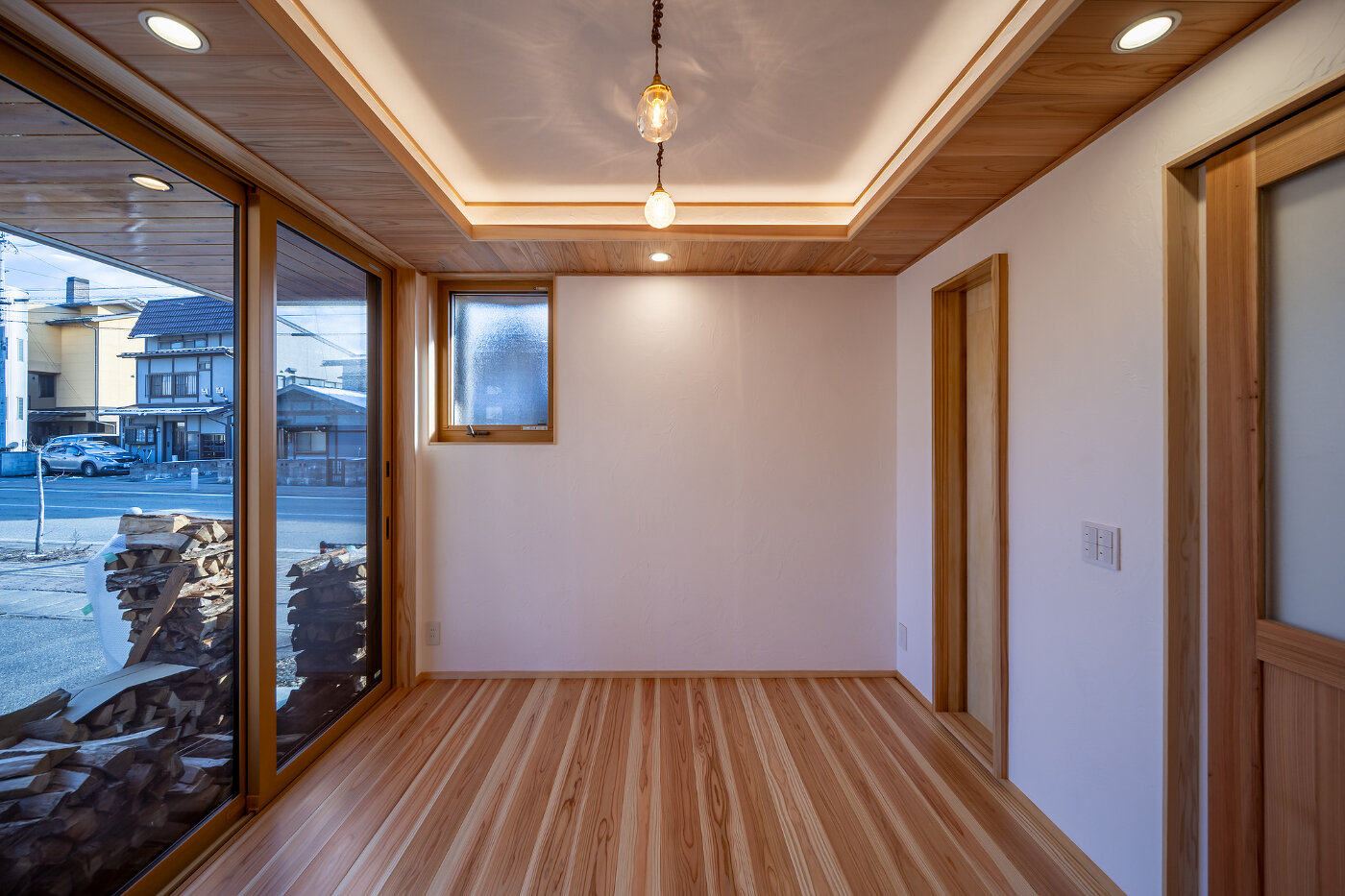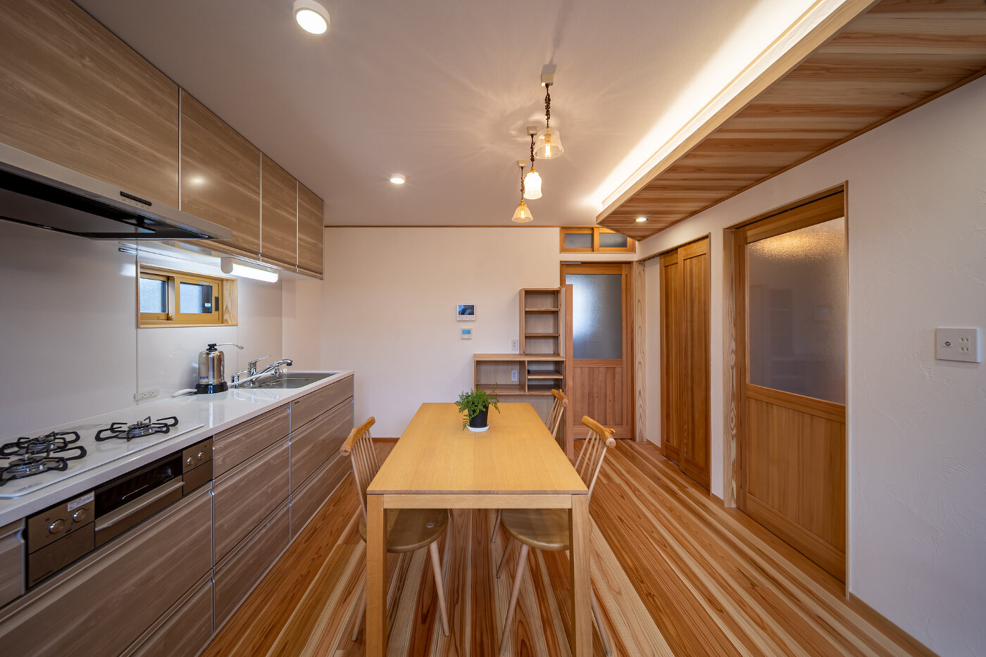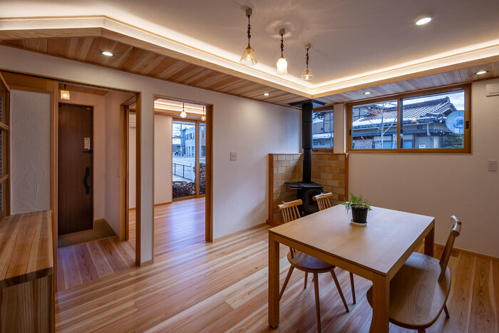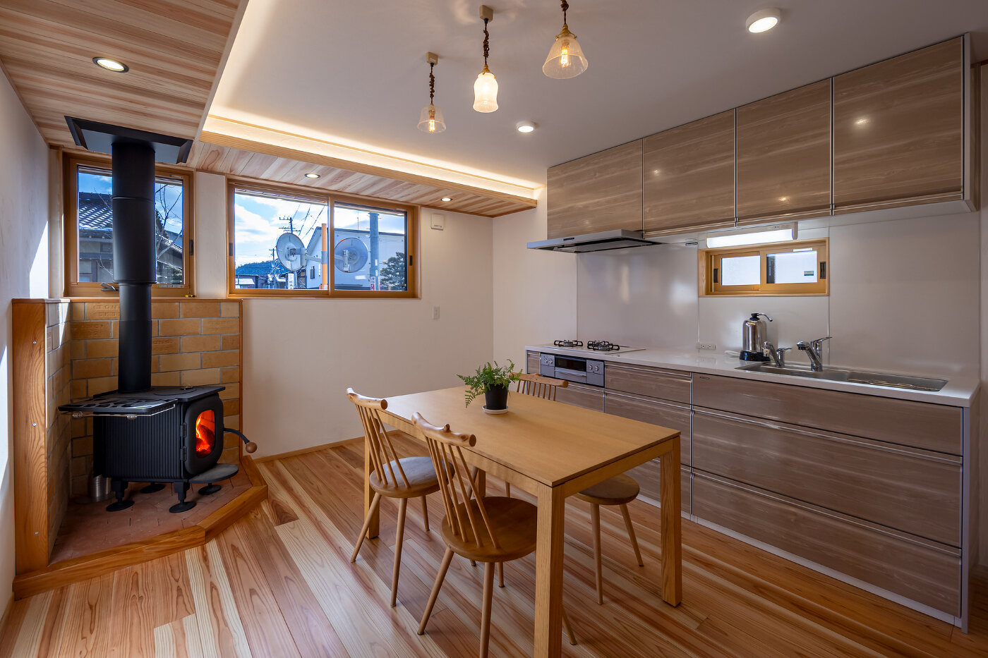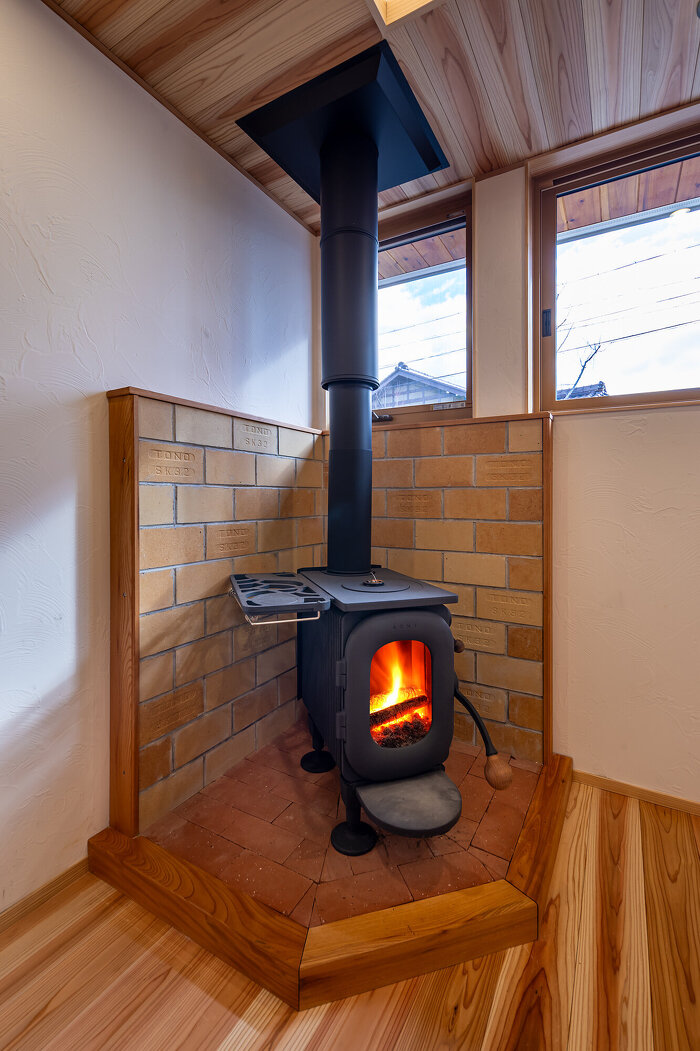 室内に足を踏み入れると、木の香りとともに広がるのは、薪ストーブの炎がつくる穏やかな時間。無垢の床や天井、造作家具が炎の揺らぎをやさしく受け止め、空間全体に深い落ち着きとぬくもりをもたらします。