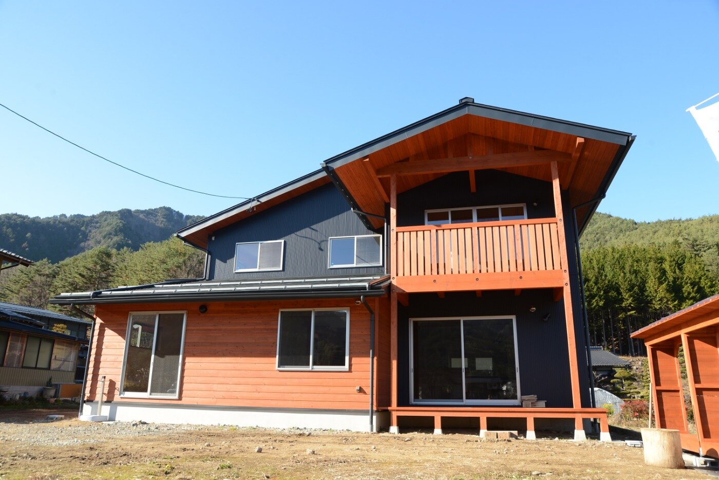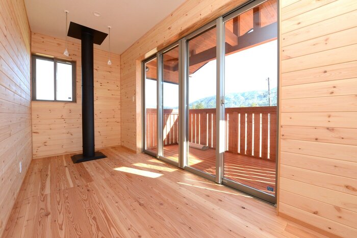 薪ストーブの煙突からの熱を利用したインナーバルコニーは洗濯物もすぐ乾きます。