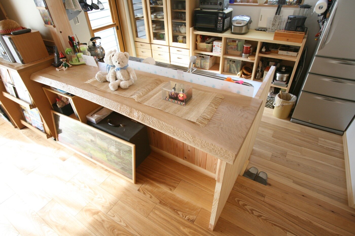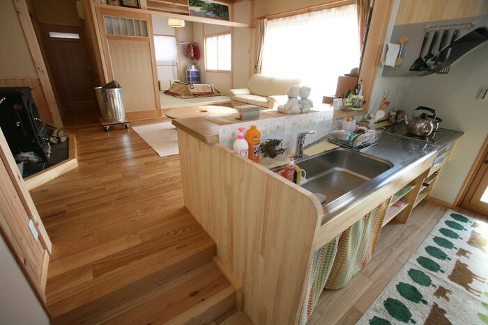 キッチンの床を下げることでダイニングとの目線が合い会話が弾む。