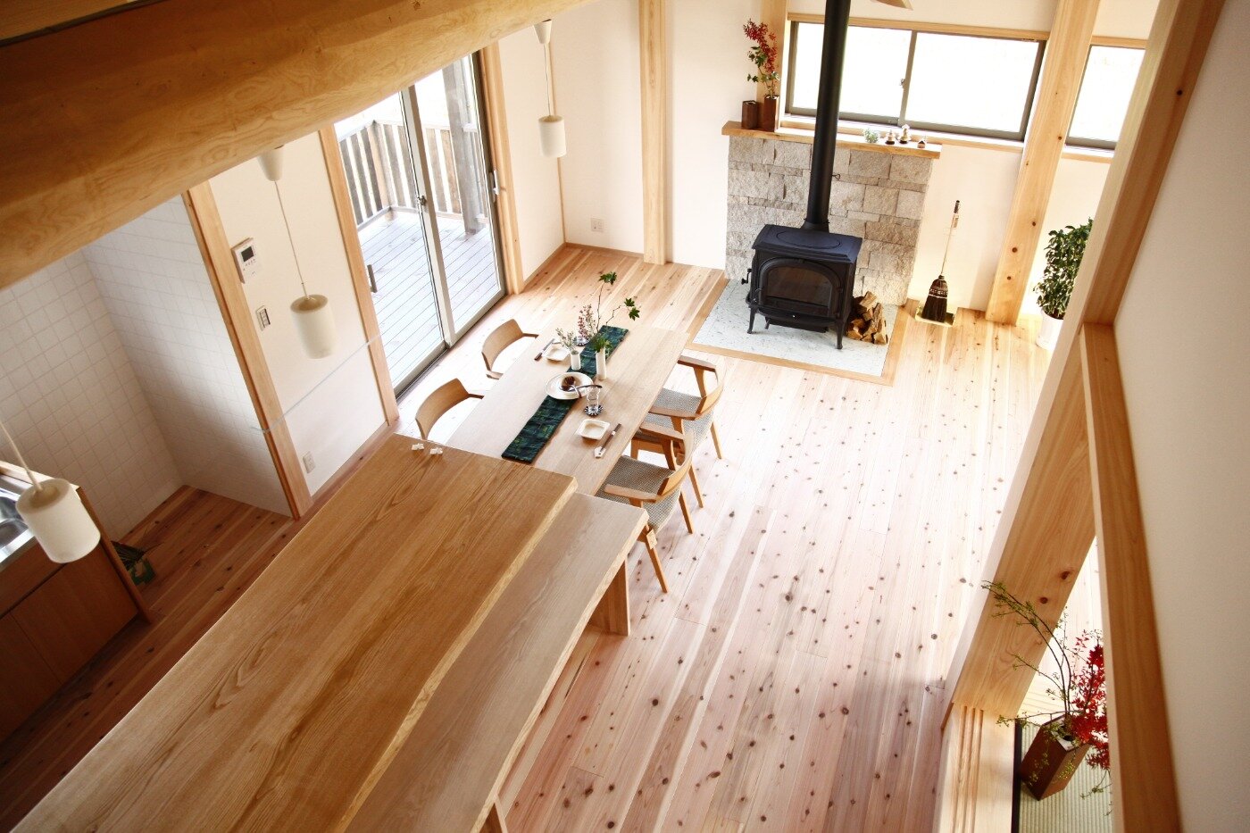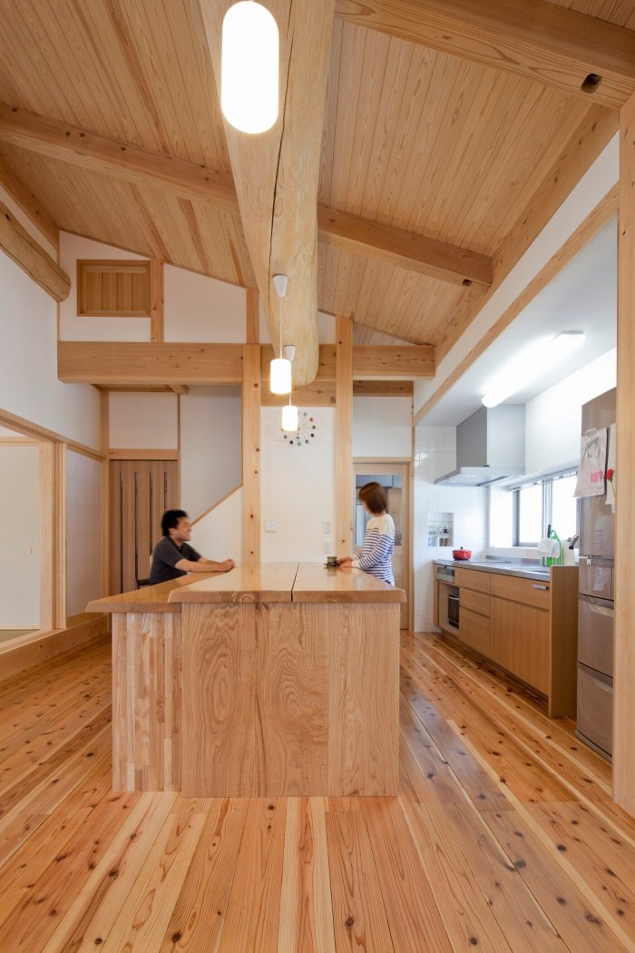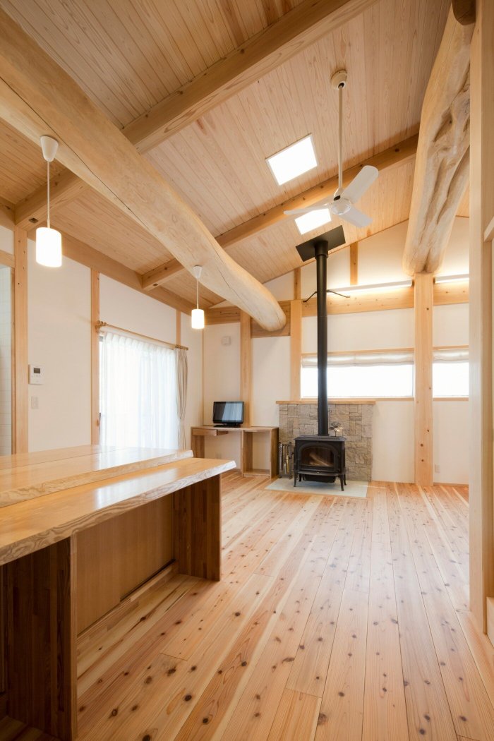 かさはら伐採チームが採取した山の木は、土台・柱・梁・天板など、あらゆる箇所に使用させて頂きました。