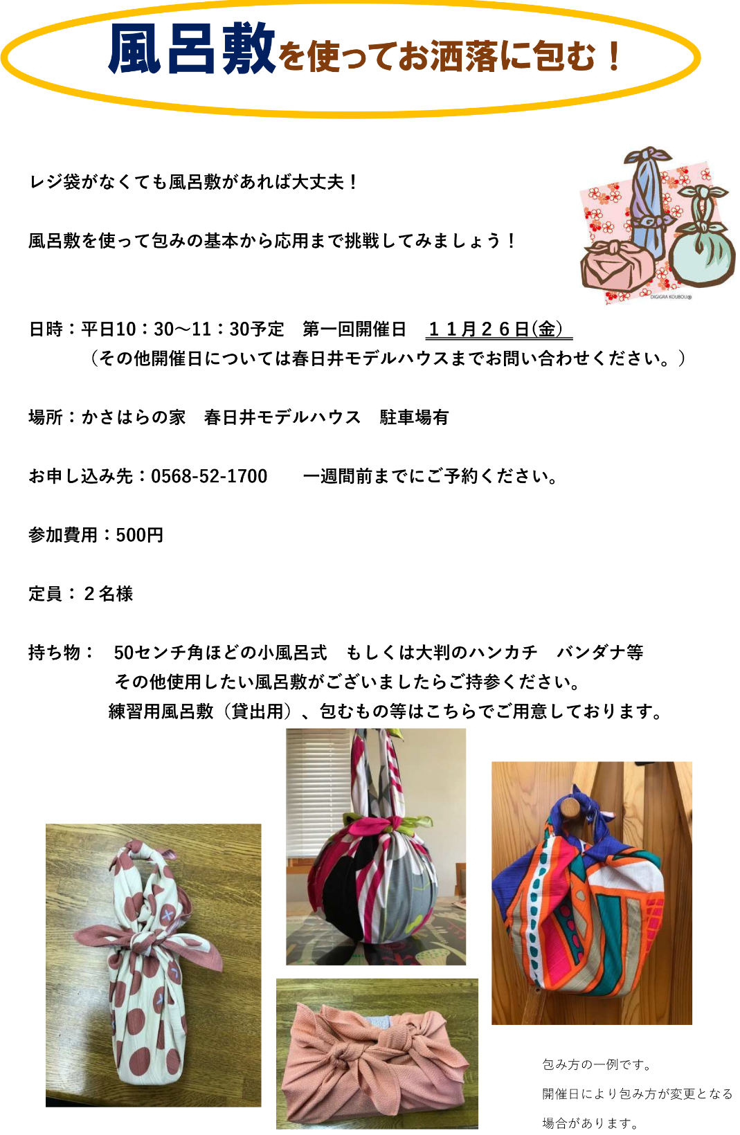 申し込み先:イベント申し込みフォーム 又は 0568-52-1700(かさはらの家 春日井モデルハウス)まで