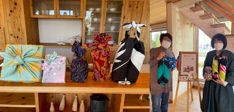また、こちらのWSでは参加費用として500円いただいているので、毎回何かしらのサプライズをご用意しております。今回は筒状の容器に入った豆菓子を用意し、練習した束ね包みで包んでいただきお持ち帰りいただきました。風呂敷包みはなかなか体験する場が少なくご参加いただいた方には好評です。