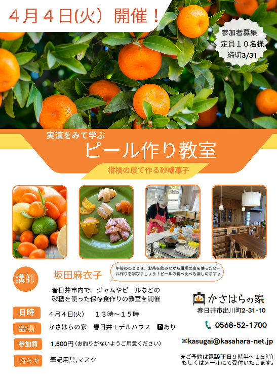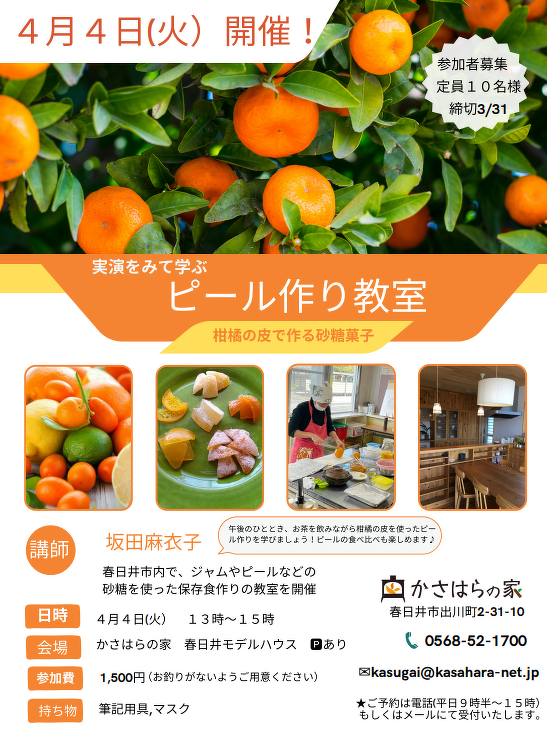 午後のひととき、お茶を飲みながら柑橘の皮を使ったピール作りを学びましょう。ピールの食べ比べも楽しめます。